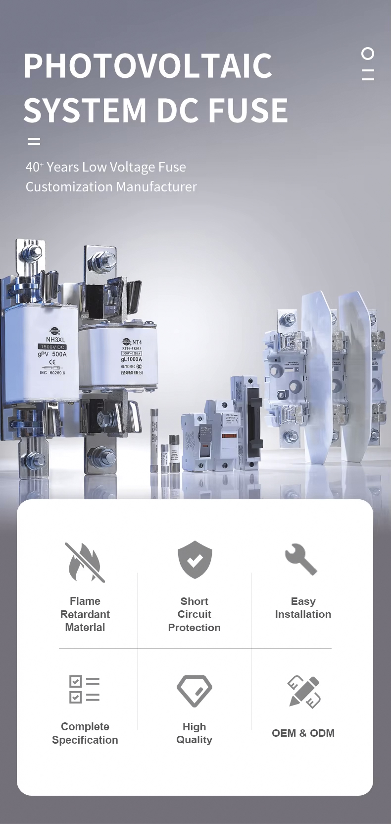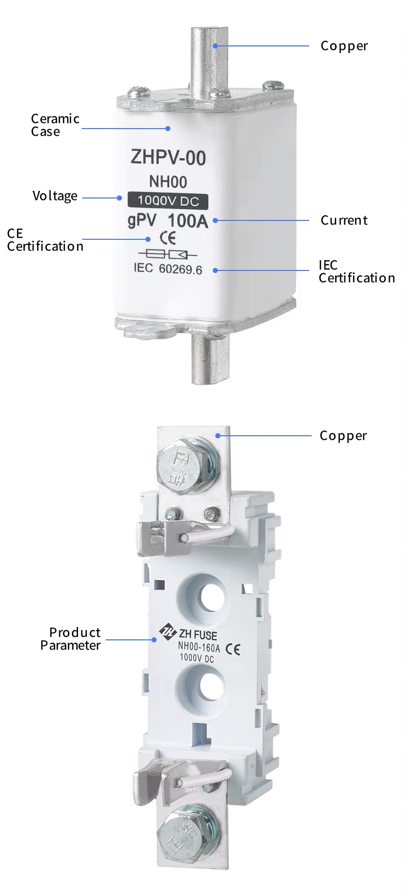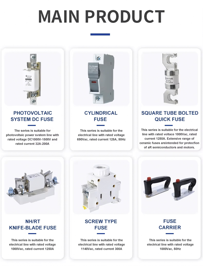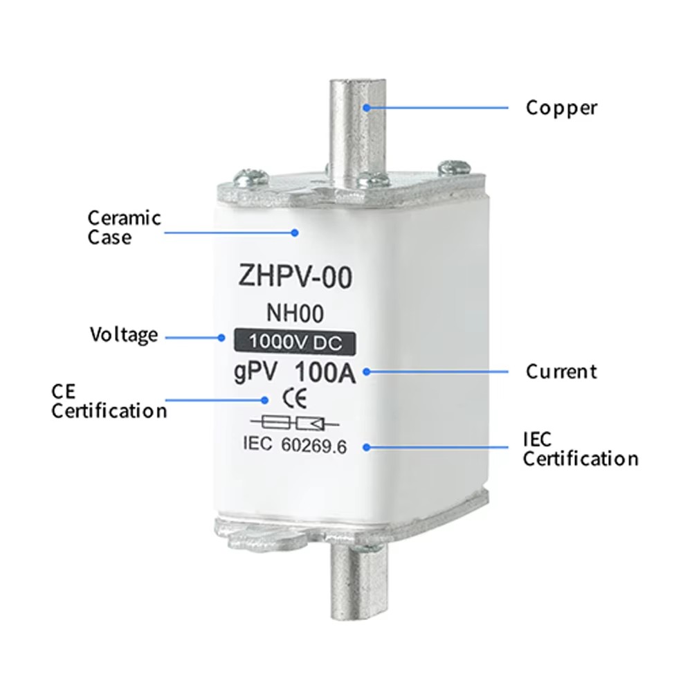 ฟิวส์ลิงค์ระบบไฟฟ้าโซลาร์เซลล์ NH00 DC 1000V 32~100A เหมาะสำหรับการป้องกันกระแสเกินในระบบไฟฟ้าโซลาร์เซลล์ DC ผลิตภัณฑ์นี้รองรับแรงดันไฟฟ้าสูงสุด 1000V DC และช่วงกระแสไฟ 32~100A ได้รับการออกแบบมาโดยเฉพาะสำหรับโรงไฟฟ้าพลังงานแสงอาทิตย์และระบบกักเก็บพลังงาน และสามารถป้องกันความเสียหายของอุปกรณ์ที่เกิดจากการโอเวอร์โหลดหรือการลัดวงจรได้อย่างมีประสิทธิภาพ
