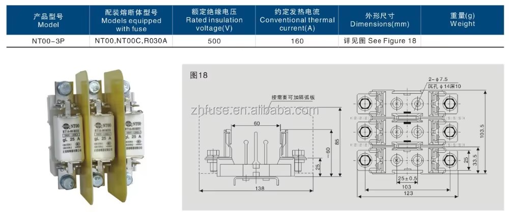 ฟิวส์ชุดนี้ประกอบด้วยลิงค์ฟิวส์และที่ยึดฟิวส์ ฐานฟิวส์ NT00-3P ทำจากพื้นเซรามิกที่มีความแข็งแรงสูงหรือพื้นเรซิ่นอุณหภูมิสูงพร้อมหน้าสัมผัสแบบคงที่แบบคอมโพสิตรูปลิ่ม มันเป็นโครงสร้างแบบเปิดที่มีการกระจายความร้อนที่ดีความแข็งแรงเชิงกลสูงการเชื่อมต่อที่เชื่อถือได้และการทำงานที่ง่าย ฐานฟิวส์ NT00-3P เข้ากันได้กับชุดนี้และตัวดึงฟิวส์ NH ใช้เพื่อลบฟิวส์ออกจากฐาน ลิงค์ฟิวส์ที่ทำจากทองแดงบริสุทธิ์หรือแผ่นเงิน (หรือลวดเงิน) ถูกปิดผนึกในหลอดละลายที่ทำจากเซรามิกที่มีความแข็งแรงสูง